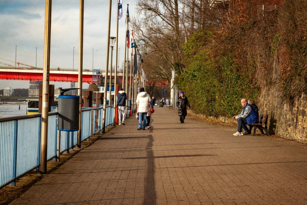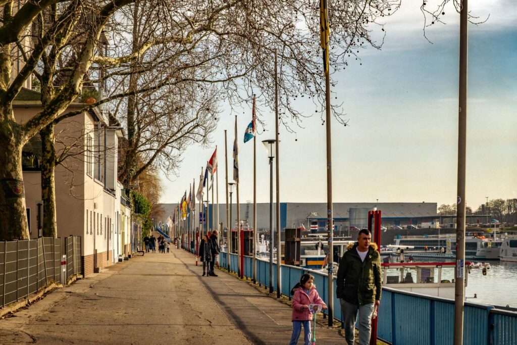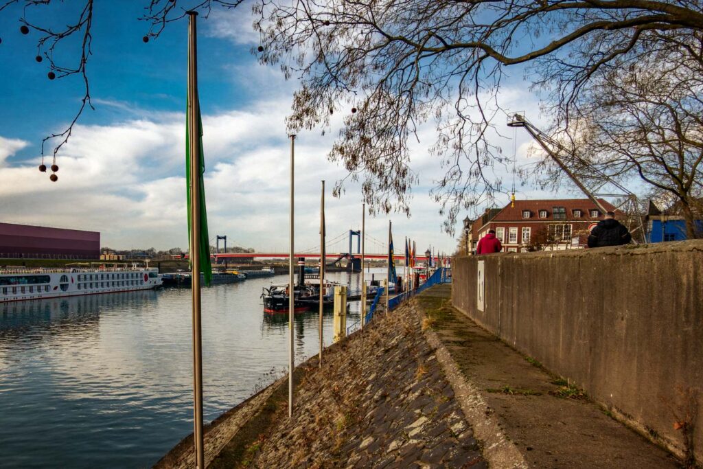 Die Promenade beginnt unterhalb des Gustav-Sander-Platzes und folgt dem Vinckekanal in Richtung Rhein.