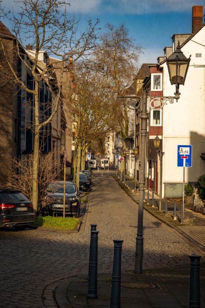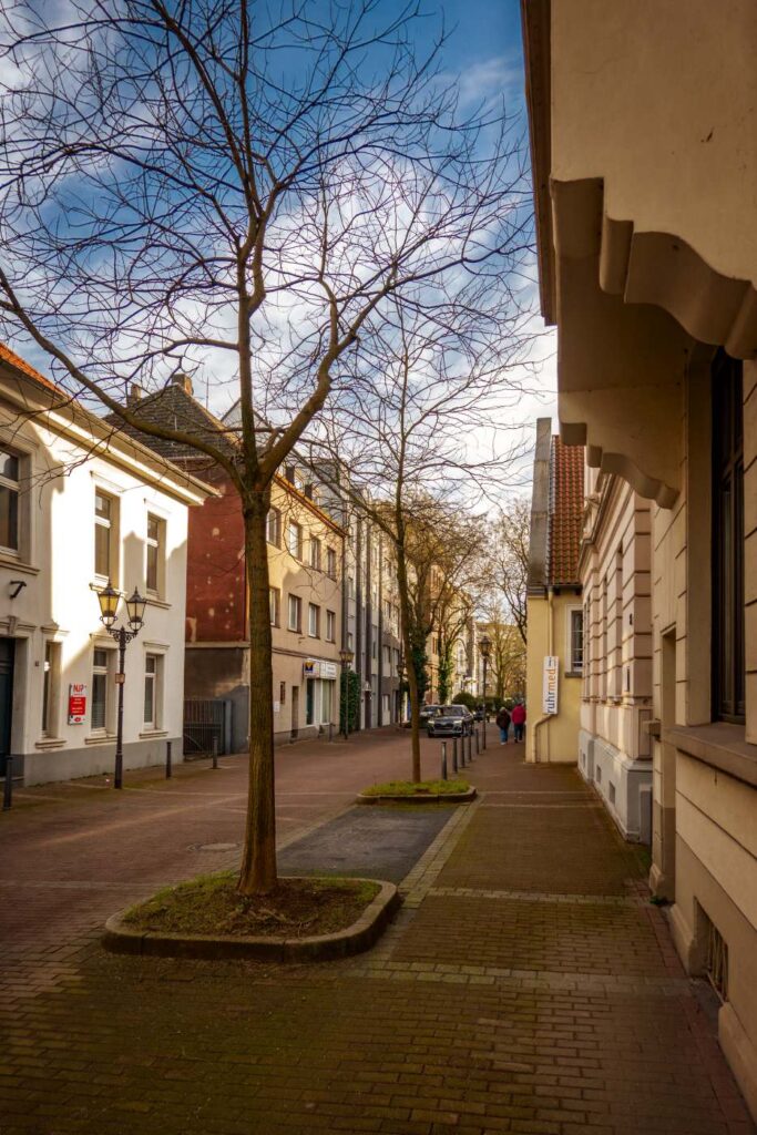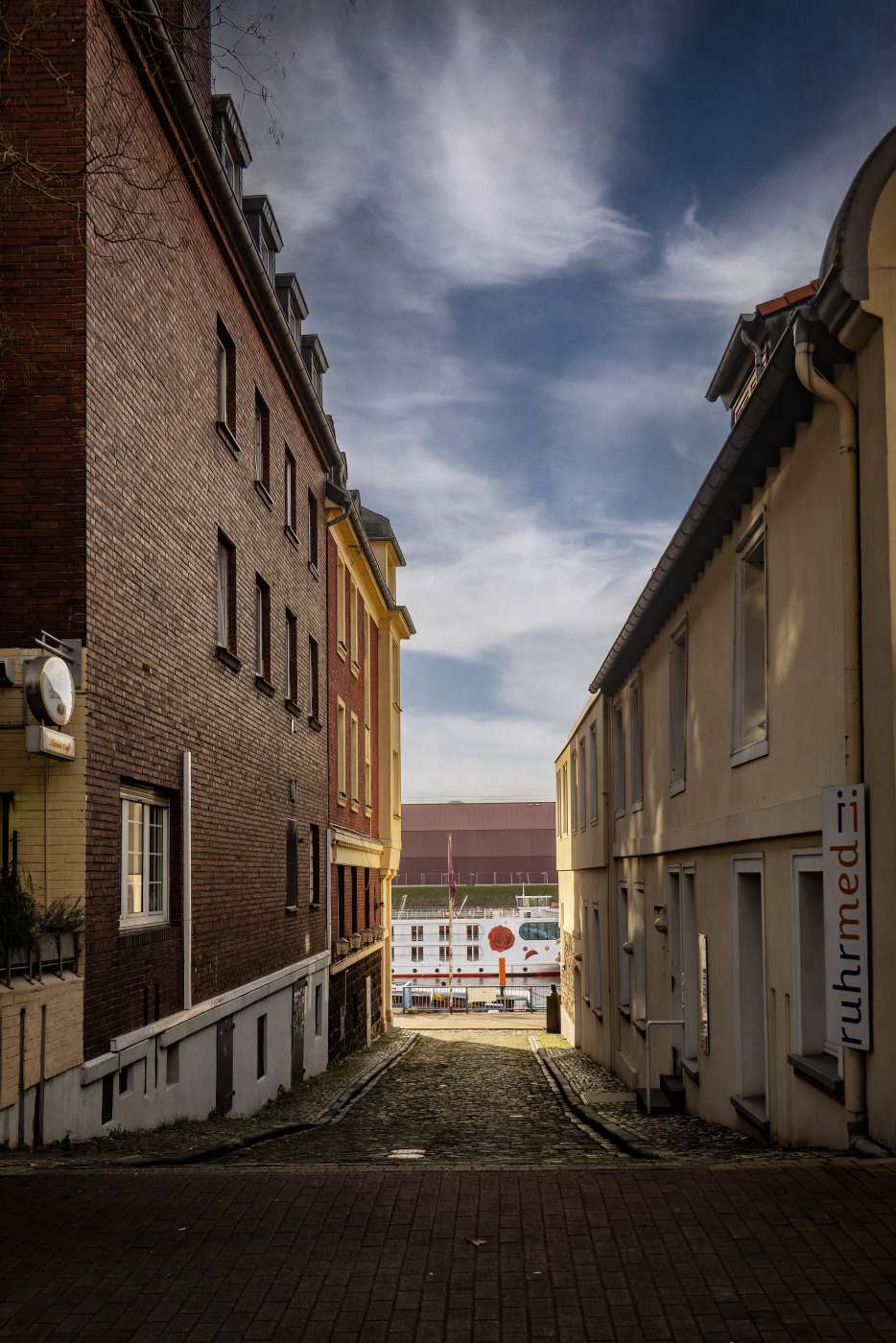 Abseits der Promenade wirkt Ruhrort überraschend ruhig. Verkehrsberuhigte Straßen, kurze Wege und eine fast zurückhaltende Wohnatmosphäre prägen diesen Teil des Viertels – nur wenige Schritte vom Hafen entfernt.