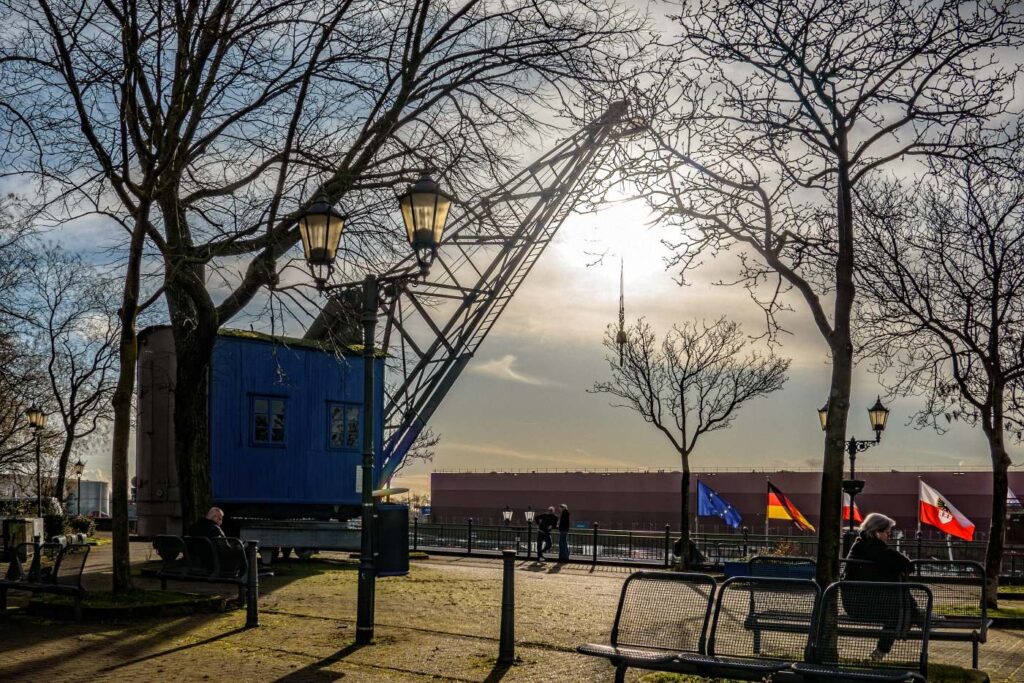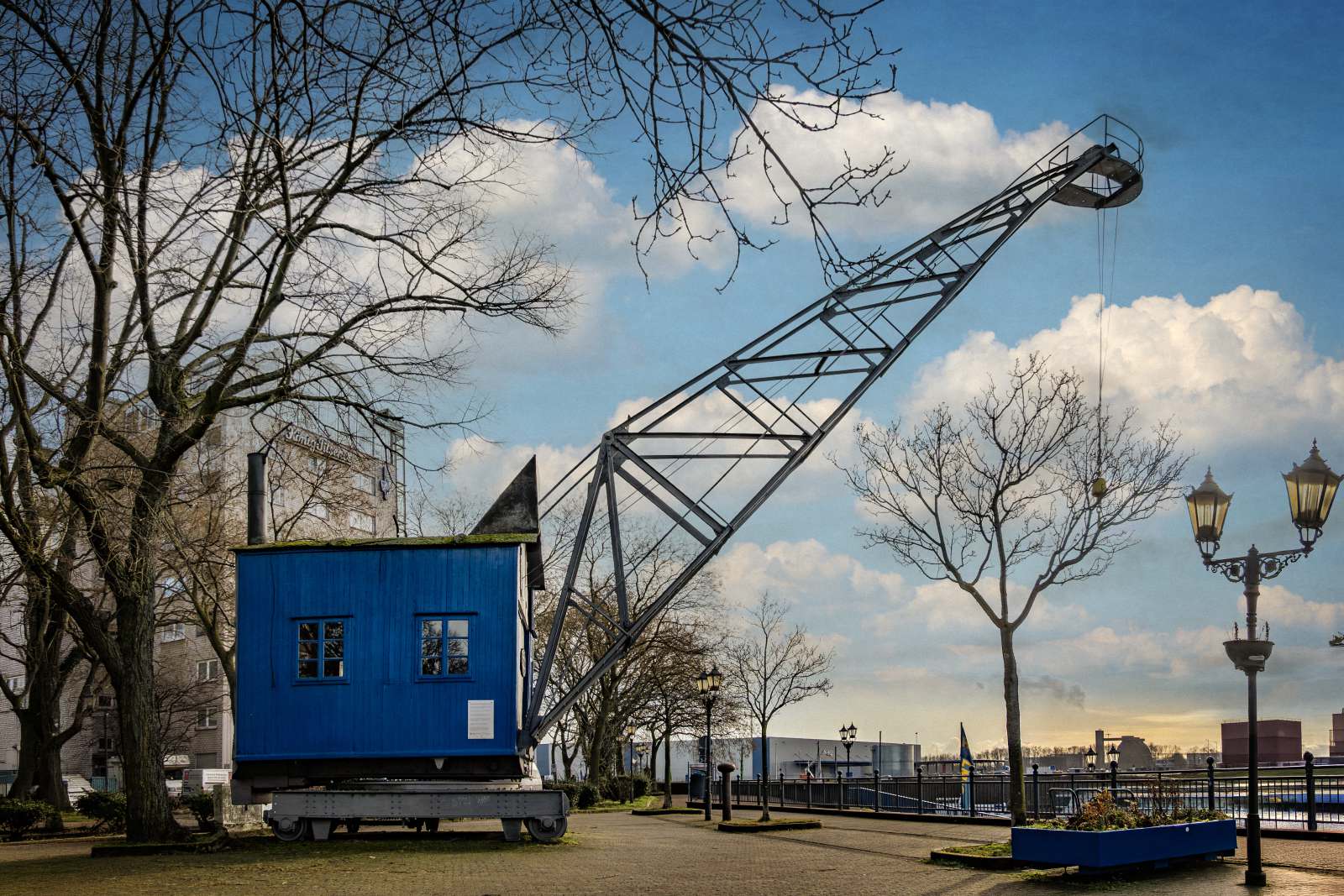 Heute hat er hier seinen Platz gefunden – sichtbar am Rand der Promenade, in unmittelbarer Nähe zur Schifferbörse. Als technisches Relikt erinnert er an die Arbeitswelt des Hafens, die Ruhrort geprägt hat und bis heute nachwirkt.