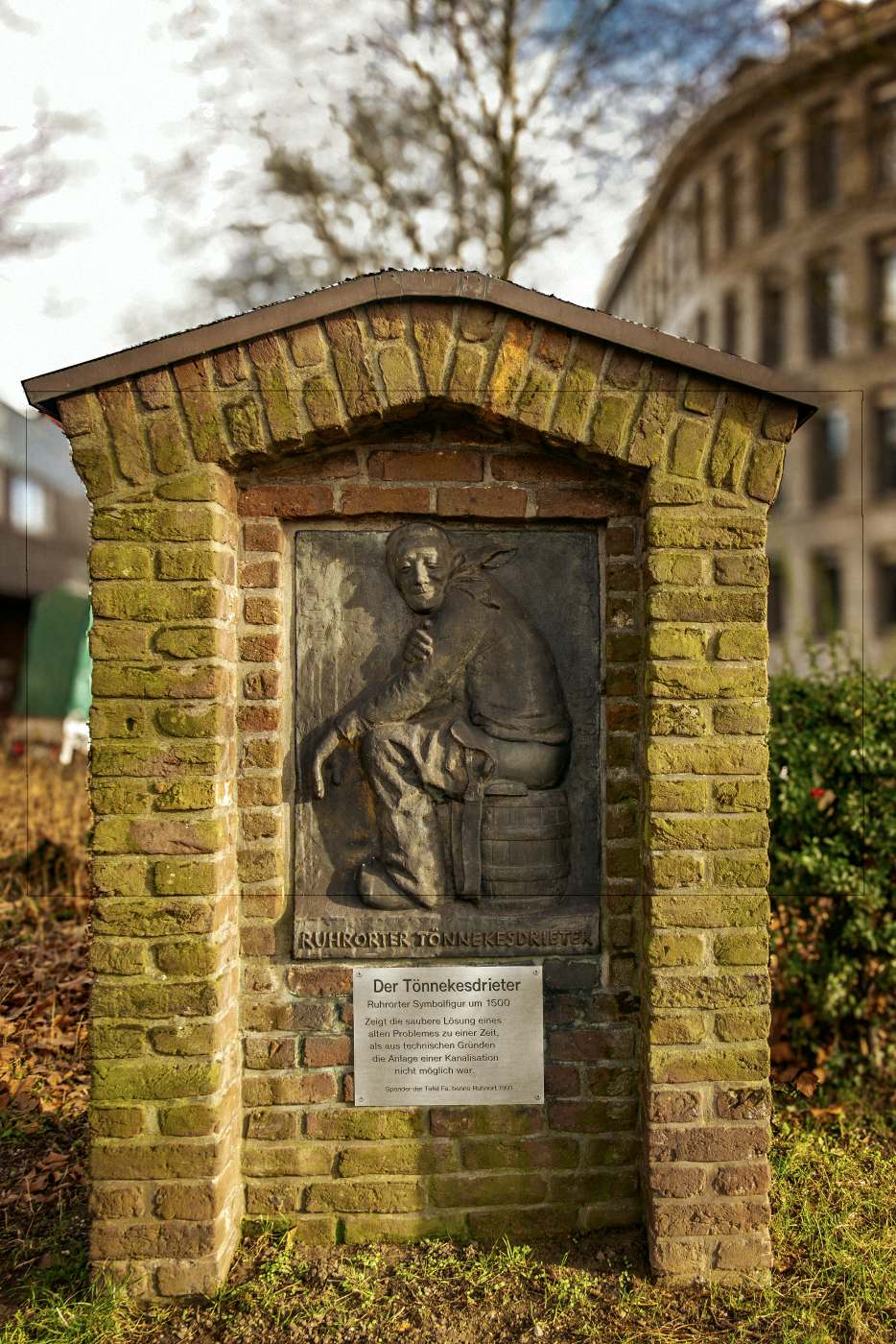 Das Bronzerelief des Tönnekesdrieters erzählt eine der ältesten Ruhrorter Geschichten. Der Name geht auf eine Zeit zurück, in der es noch keine Kanalisation gab und die menschlichen Hinterlassenschaften in sogenannten „Tönnekes“ gesammelt wurden, welche später zum Verdruss der Schiffer im Hafen entsorgt wurden.