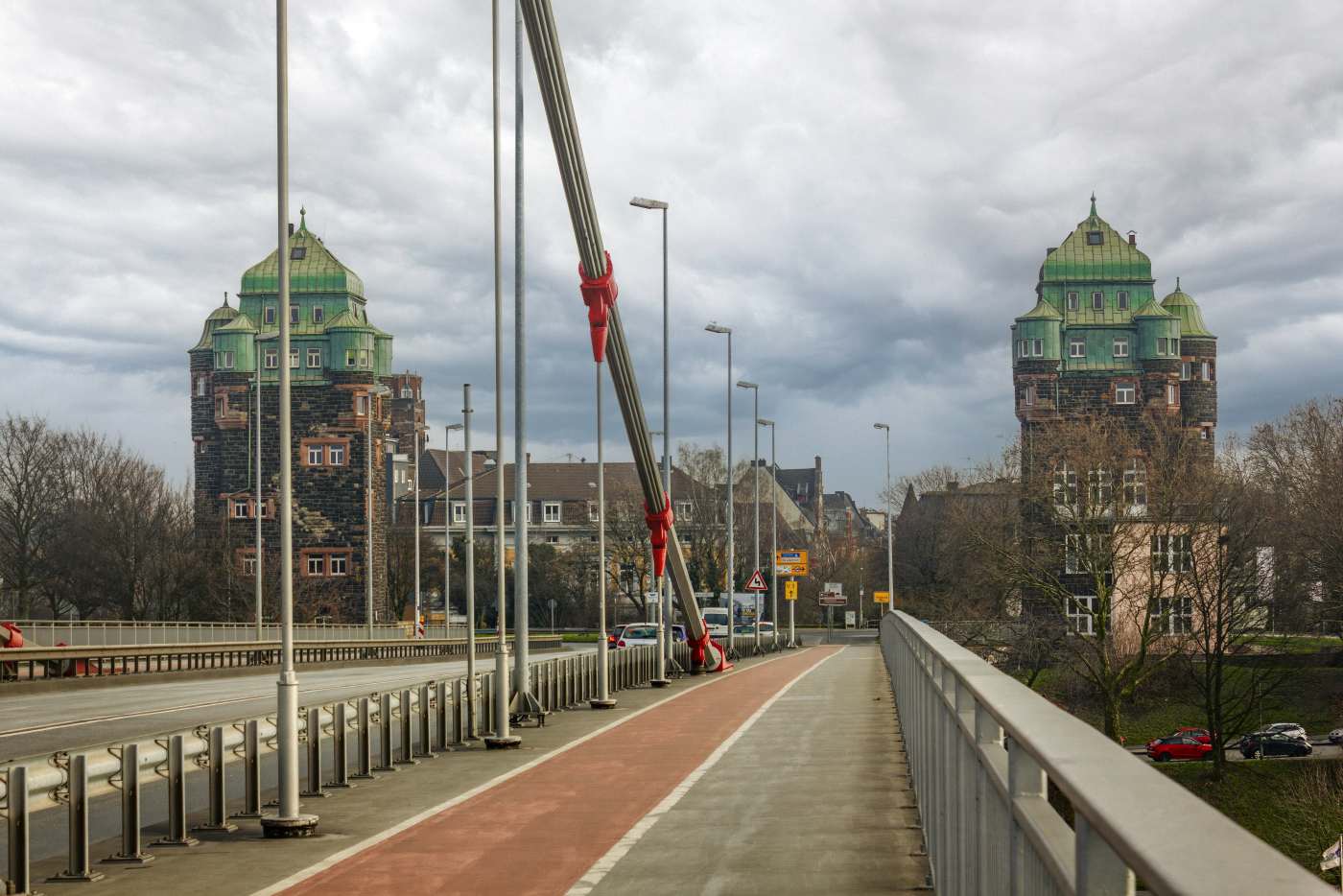 Dort, wo Hafenmund, Rhein und die Einfahrt in den alten Eisenbahnhafen die Ruhrorter Festwiese rahmen, stehen die beiden Brückentürme und heißen Besucher, die den Strom queren, in Ruhrort willkommen.