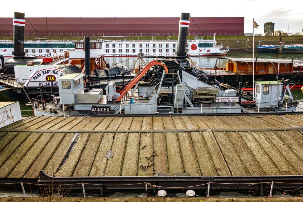 Nur wenige Schritte vom Gustav-Sander-Platz entfernt, auf Höhe der Schifferbörse, liegen drei historische Schiffe am Kai. Heute sind sie Teil des Binnenschifffahrtsmuseums – und zugleich stille Zeugen einer Arbeitswelt, die Hafen und Fluss über Jahrzehnte prägten.